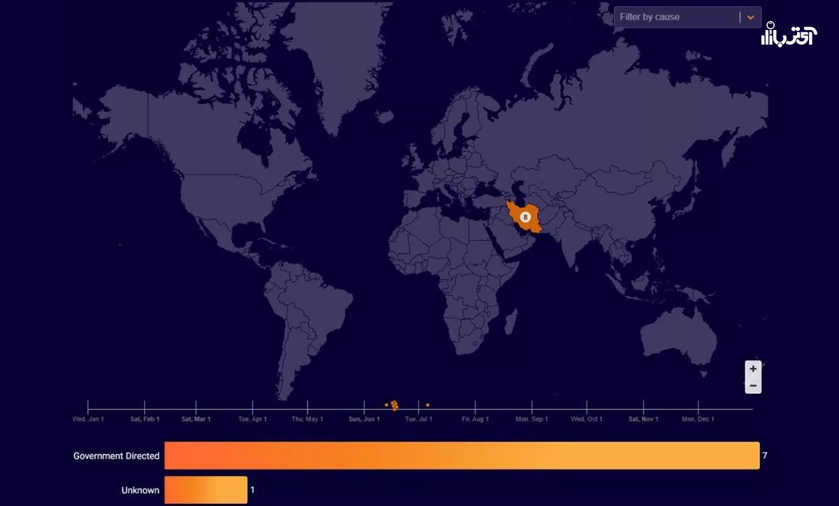 در بخش دیگری از گزارش، کلودفلر به ثبت ۸ اختلال بزرگ اینترنتی در ایران طی سال گذشته میلادی اشاره میکند. بهگفته این شرکت، ۷ مورد از این اختلالها منشأ دولتی داشته و یک مورد علت مشخصی نداشته است. نکته قابلتوجه این است که تمام این قطعیها در بازه زمانی ۱۳ ژوئن تا ۵ ژوئیه (خرداد و تیر) رخ دادهاند.